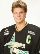 Simon Gamache a été invité au Match des Etoiles de la LHJMQ en 2000, disputé au Centre Molson. On le voit ici avec Mike Ribeiro juste derrière lui après un but.