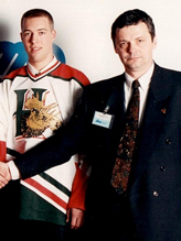 HALIFAX - 1994 | Harold MacKay, (président) | Etienne Drapeau (attaquant recrue) | Jean-Sébastien Giguère (gardien) | Clément Jodoin (entraîneur-chef)