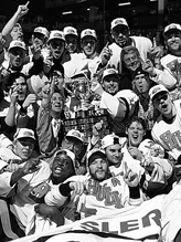 1988 -Cam Russell et Marc Saumier soulèvent l'entraîneur-chef Alain Vigneault pour célébrer la conquête de la Coupe du Président